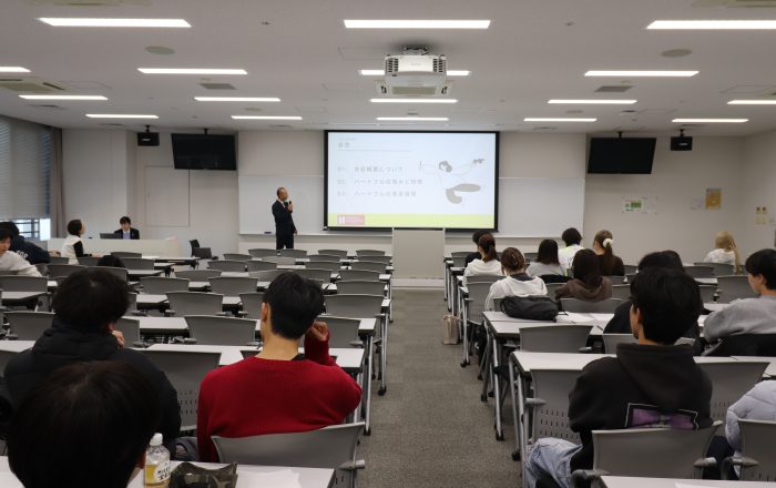 今年も一昨年・昨年同様、愛知淑徳大学へ赴き、産学連携の講義に参加させていただきました。産学連携プロジェクトは、まず大学の講義の1コマ内で、学生にハートフルマンションの会社説明をし、論題を提示します(①)。学生の皆さんはチームに分かれて、論題にむけた解決策などを議論しチーム内の意見をまとめ、後日、中間プレゼンとして弊社に提案をしていただきます(②)。その内容について助言、要望などを伝