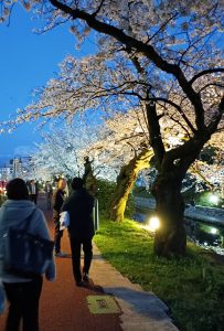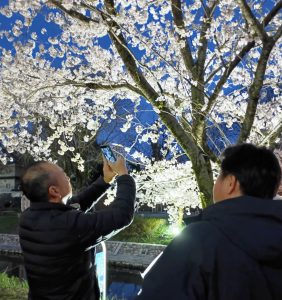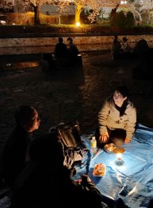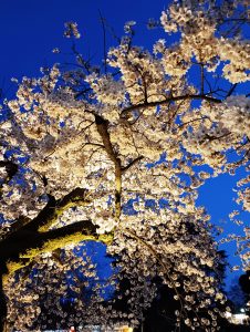 いつも食べるお弁当も夜桜を眺めながら皆で食べると、最高のディナーで社員同士の親睦もさらに深まったと思います。